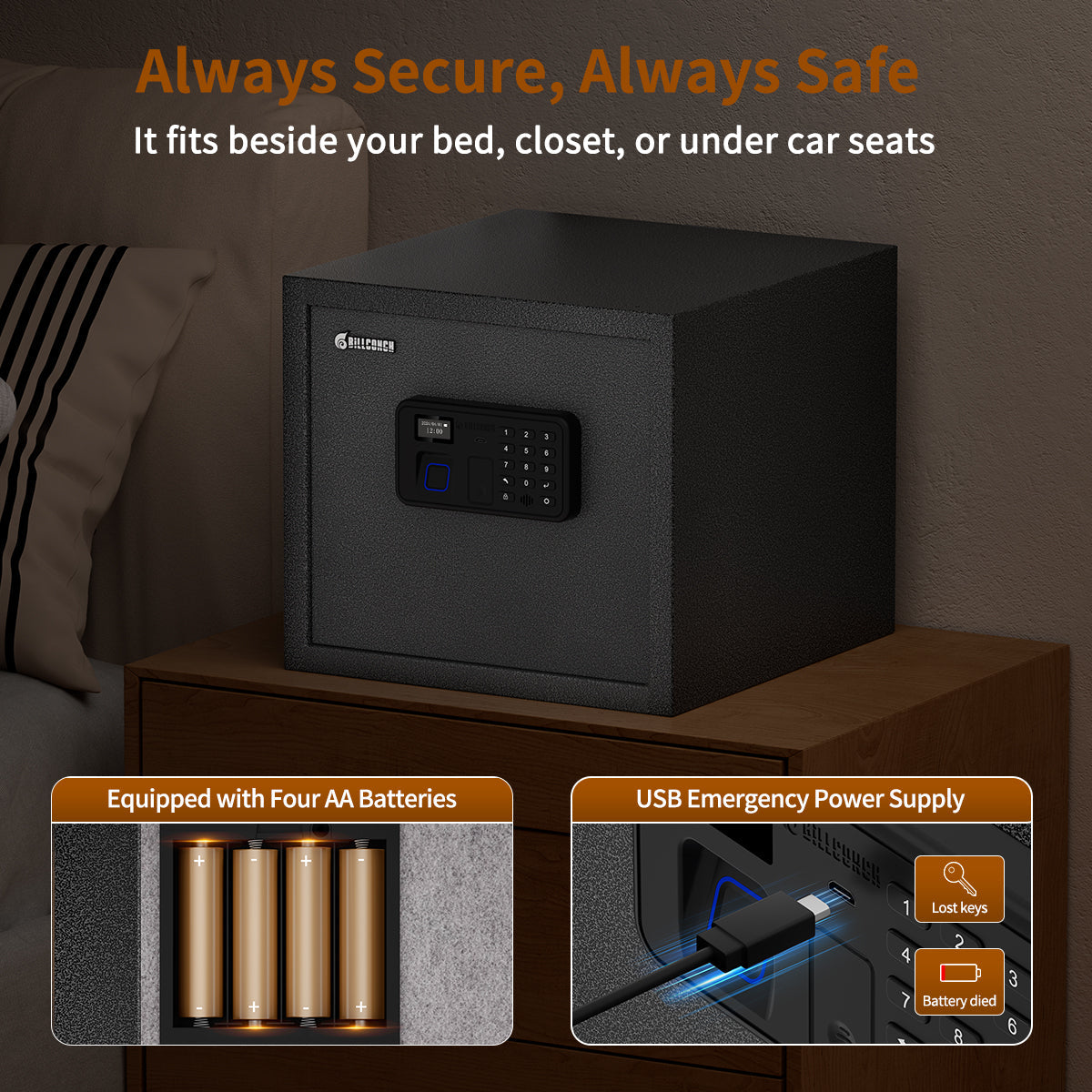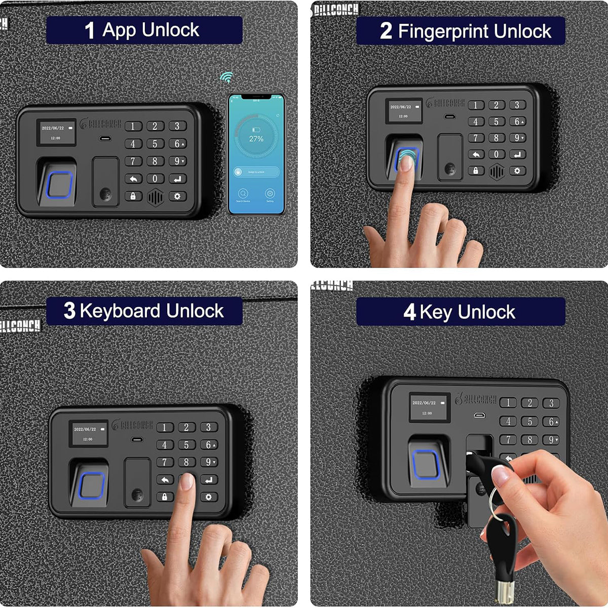 Fingerprint Recognition: Biometric safe uses high-quality fingerprint biometric technology, seconds fast recognition speed and record 40 sets of fingerprints. You can also connect smart phone, the safe can be unlocked by smart phone