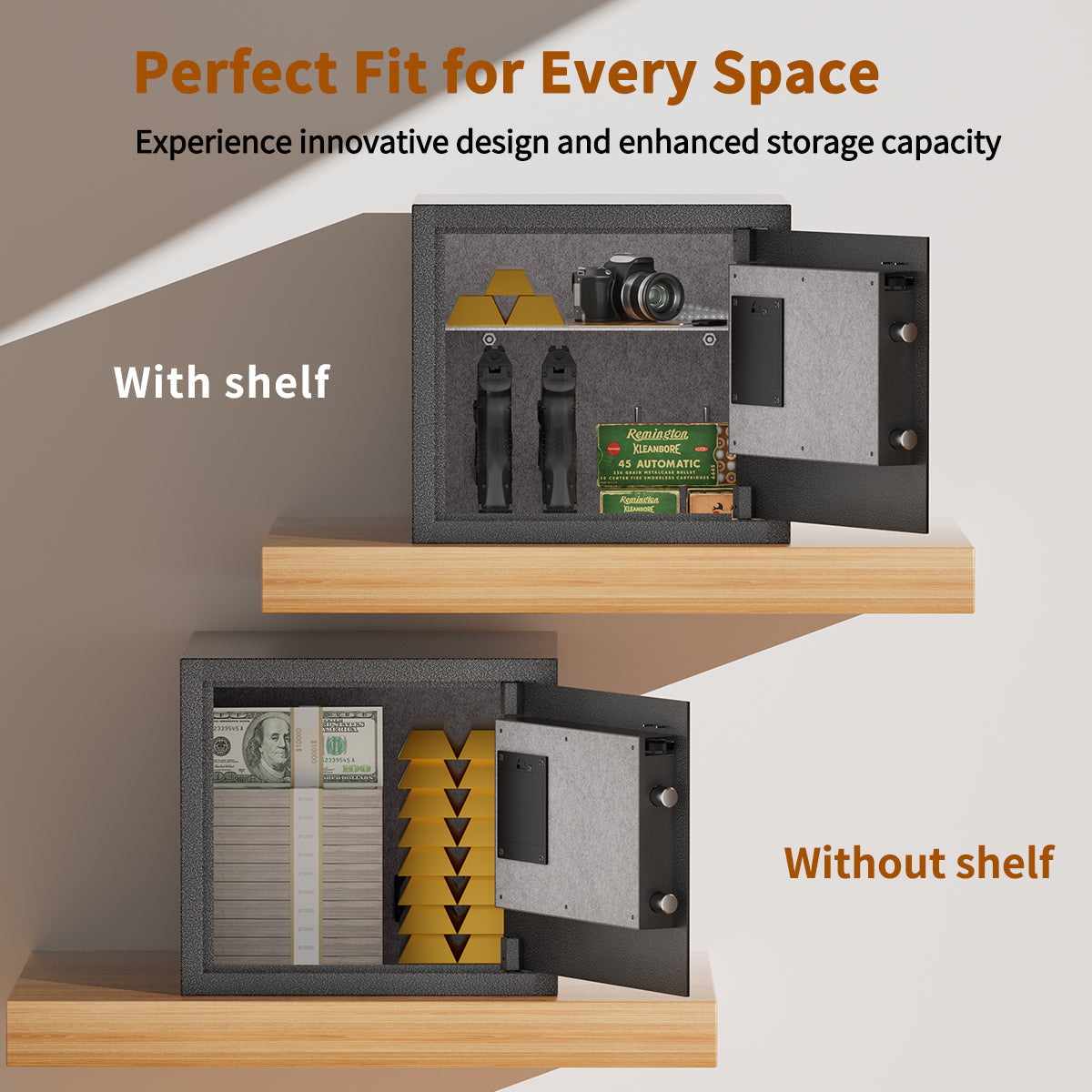 Unique Pistol Bracket Design: The gun safe featured with an innovative pistol bracket design, ensuring secure and organized storage for your handguns, protecting your children from accidental access. The support bar can be unscrewed and repositioned into a side hole of the bracket base to optimize space and convenience
